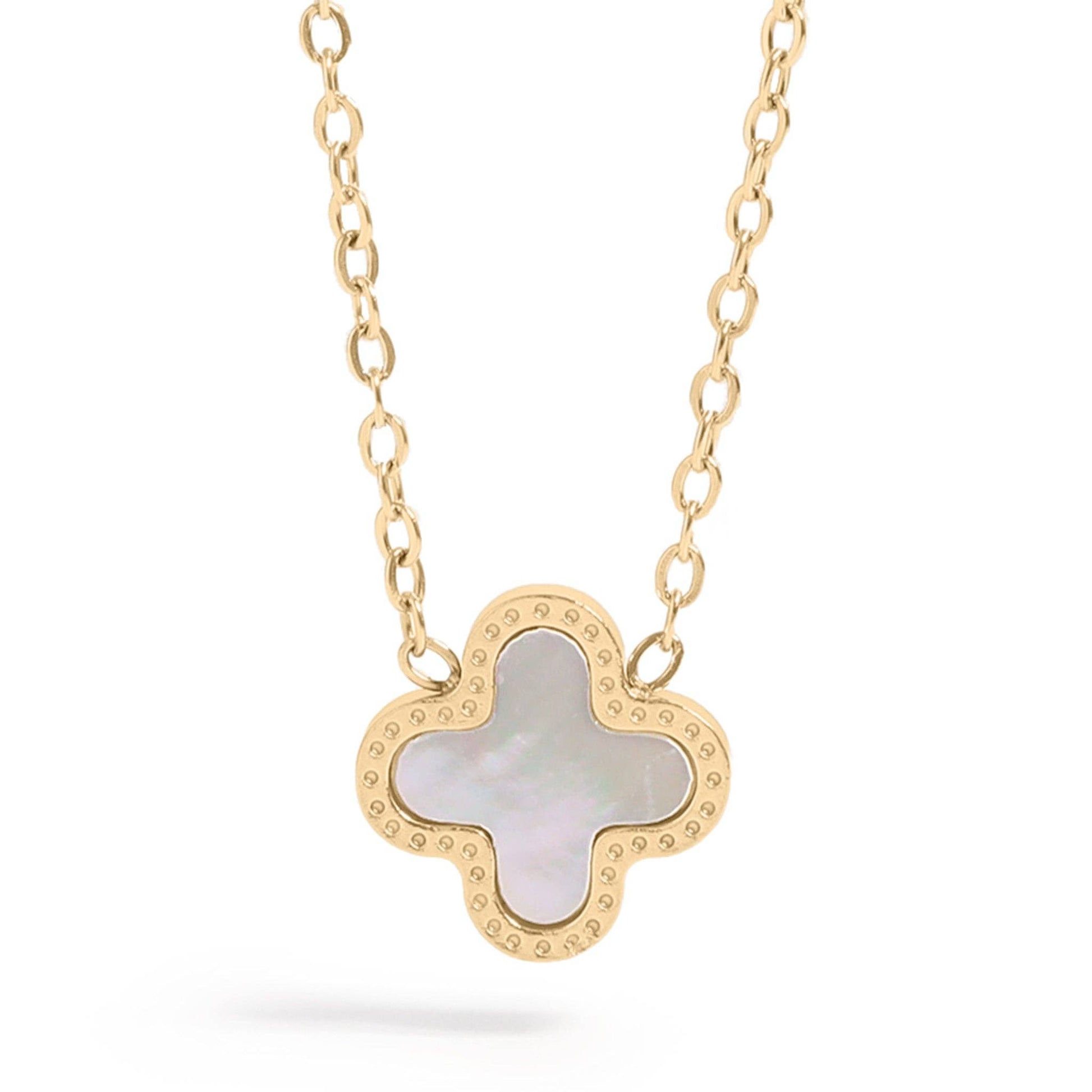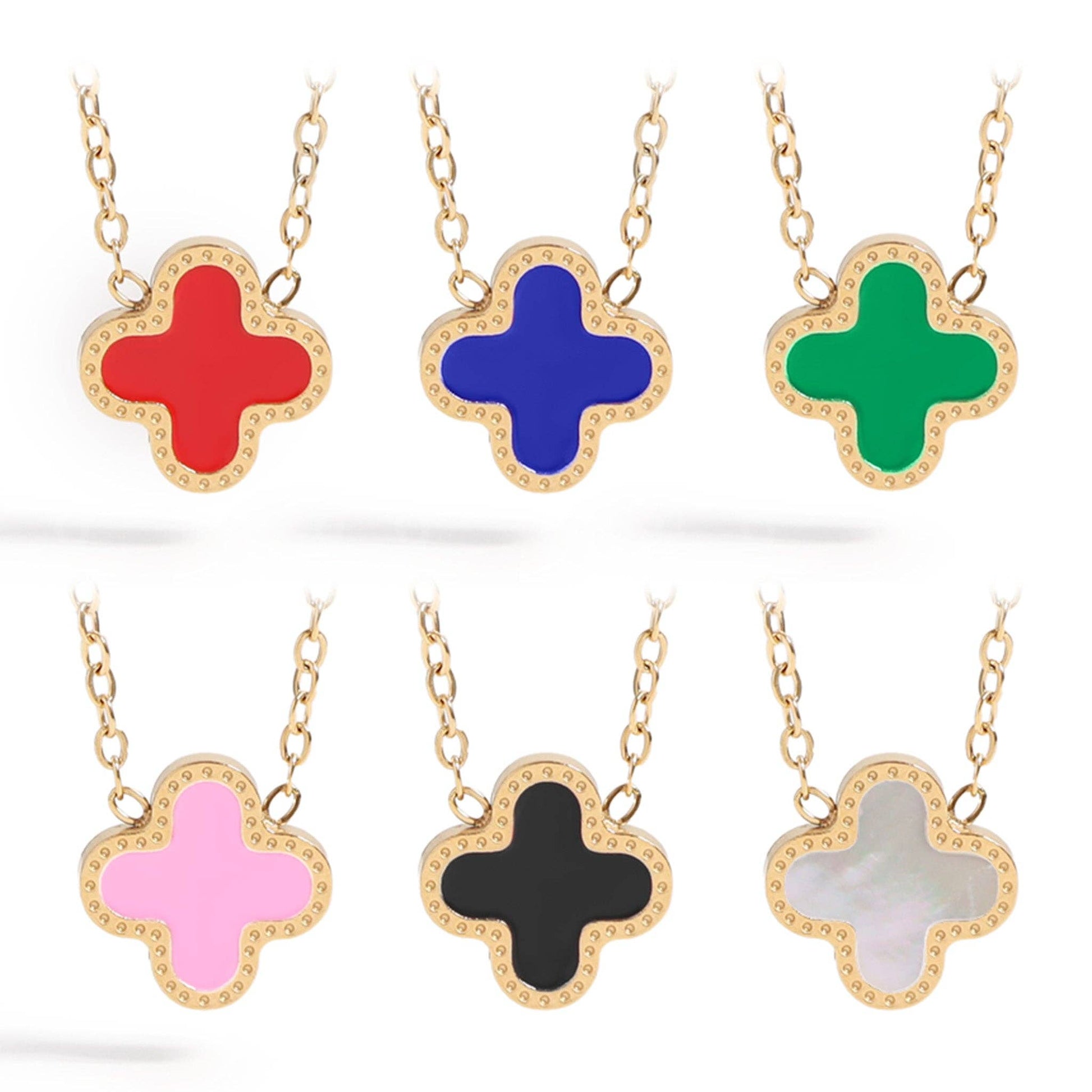 This Necklace features a luxurious 18k PVD Gold coating Stainless Steel that enhances its beauty and provides excellent durability and resistance to tarnishing. The lucky clover symbolizes prosperity and good luck, making a thoughtful gift for anyone seeking extra fortune in their lives! ★ Available Colors: blue, pearl, green, pink, or black! ✦ 100% Waterproof, Non-tarnish, Hypoallergenic ✦ Designed for All Skin Types - PVD COATING - will never turn your skin green. Approx. Necklace Dimensions: 16"+2" extension Approx. Necklace Width: 2mm Approx. Charm Dimensions: 13mm x 13mm Approx. Weight: 3 grams